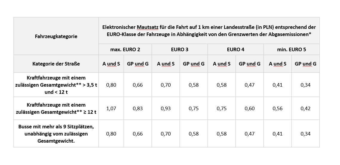 • Obligatorisch ist die Zahlung der elektronischen Maut für Benutzer von schweren Fahrzeugen, d. h. Kraftfahrzeugen, Fahrzeugkombinationen mit einem zulässigen Gesamtgewicht von mehr als 3,5 Tonnen und Bussen.